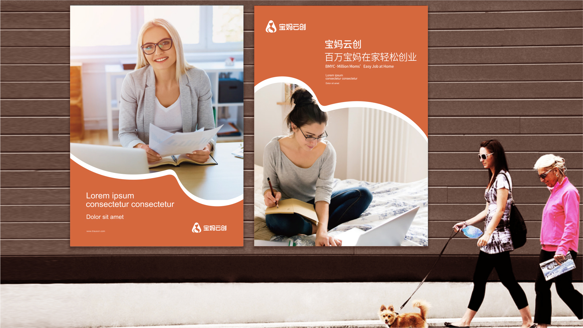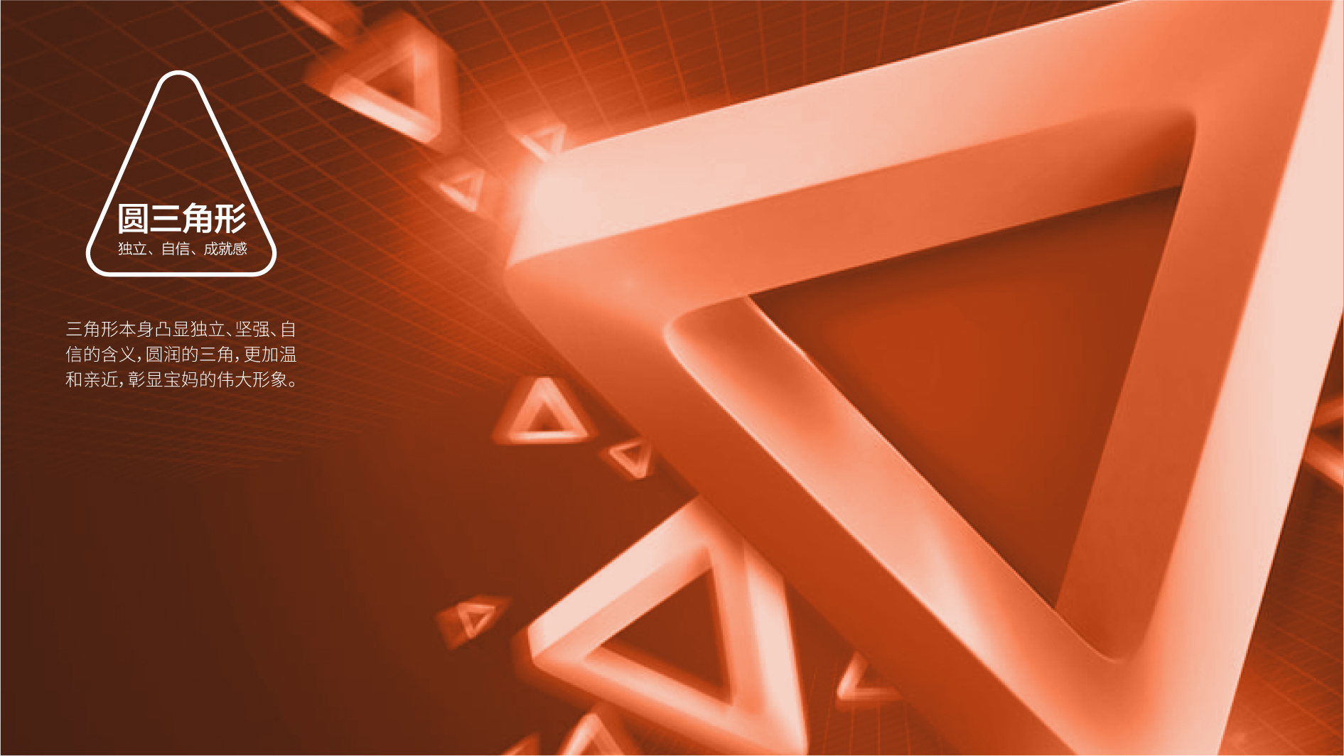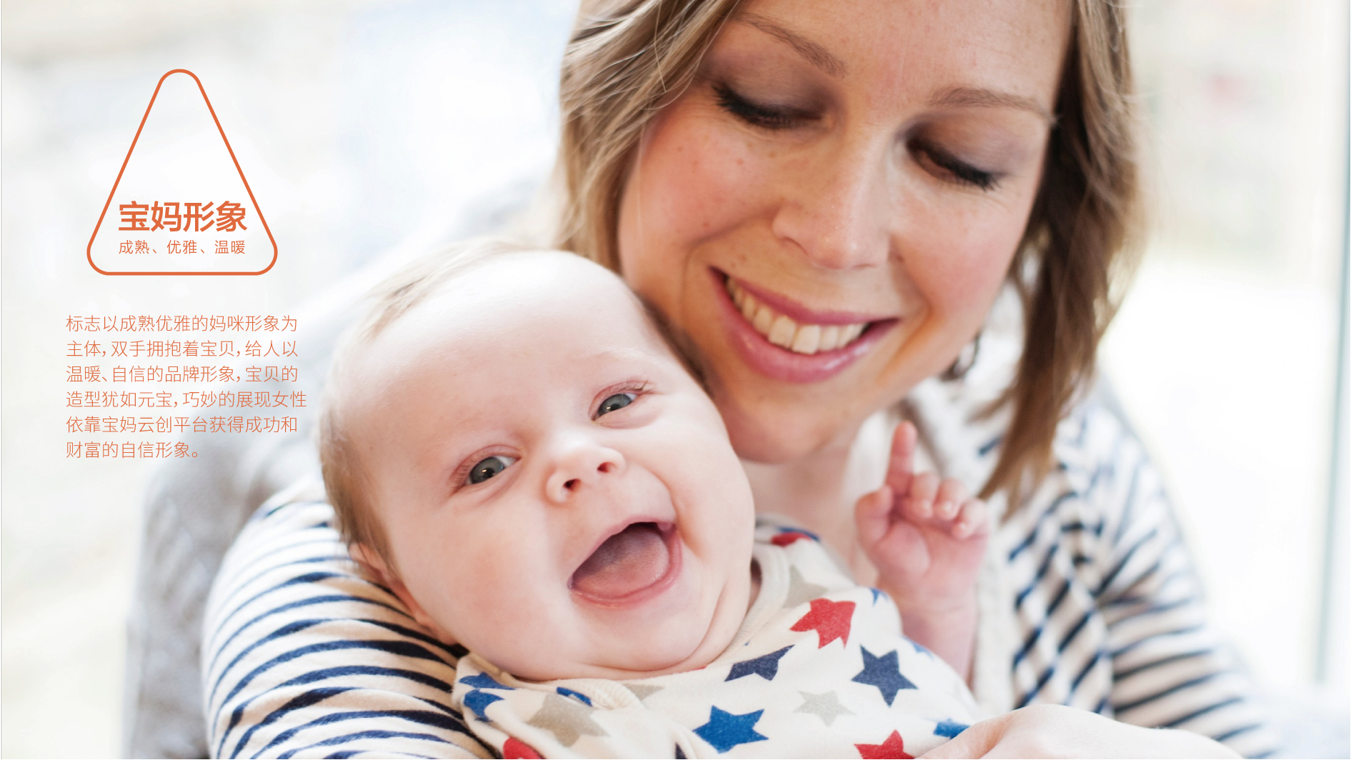 和與德根據寶媽云創的企業價值觀、品牌氣質和品牌內涵,選擇橙色為標準色彩,象征了生命的活力,對事業的熱情,展現辣媽生命的光彩。標志以成熟優雅的媽咪形象為主體,雙手擁抱著寶貝,給人以溫暖、自信的品牌形象,寶貝的造型猶如元寶,巧妙的展現女性依靠寶媽云創平臺獲得成功和財富的自信形象。而三角形本身凸顯獨立、堅強、自信的含義,圓潤的三角,更加溫和親近,彰顯寶媽的偉大形象。
