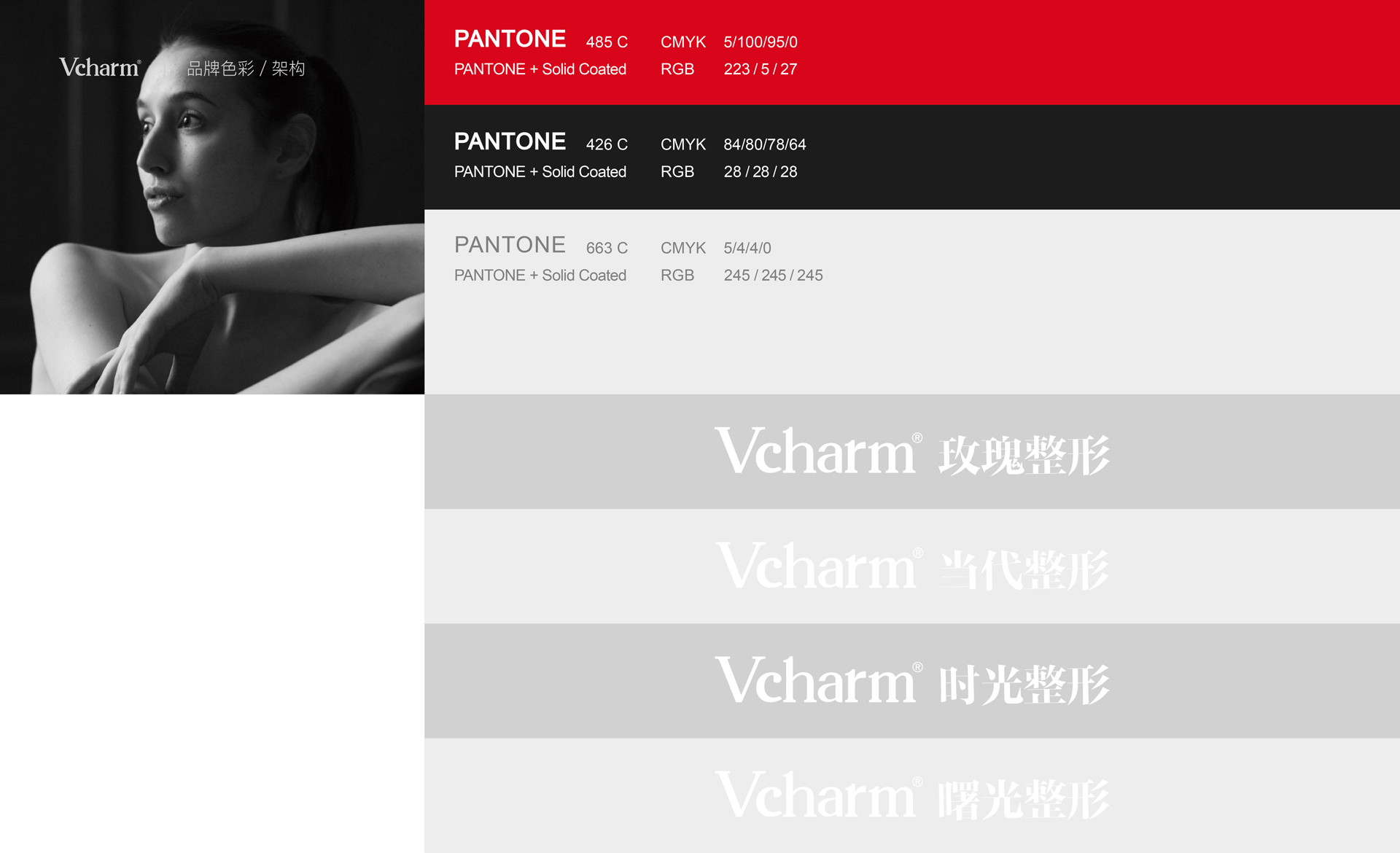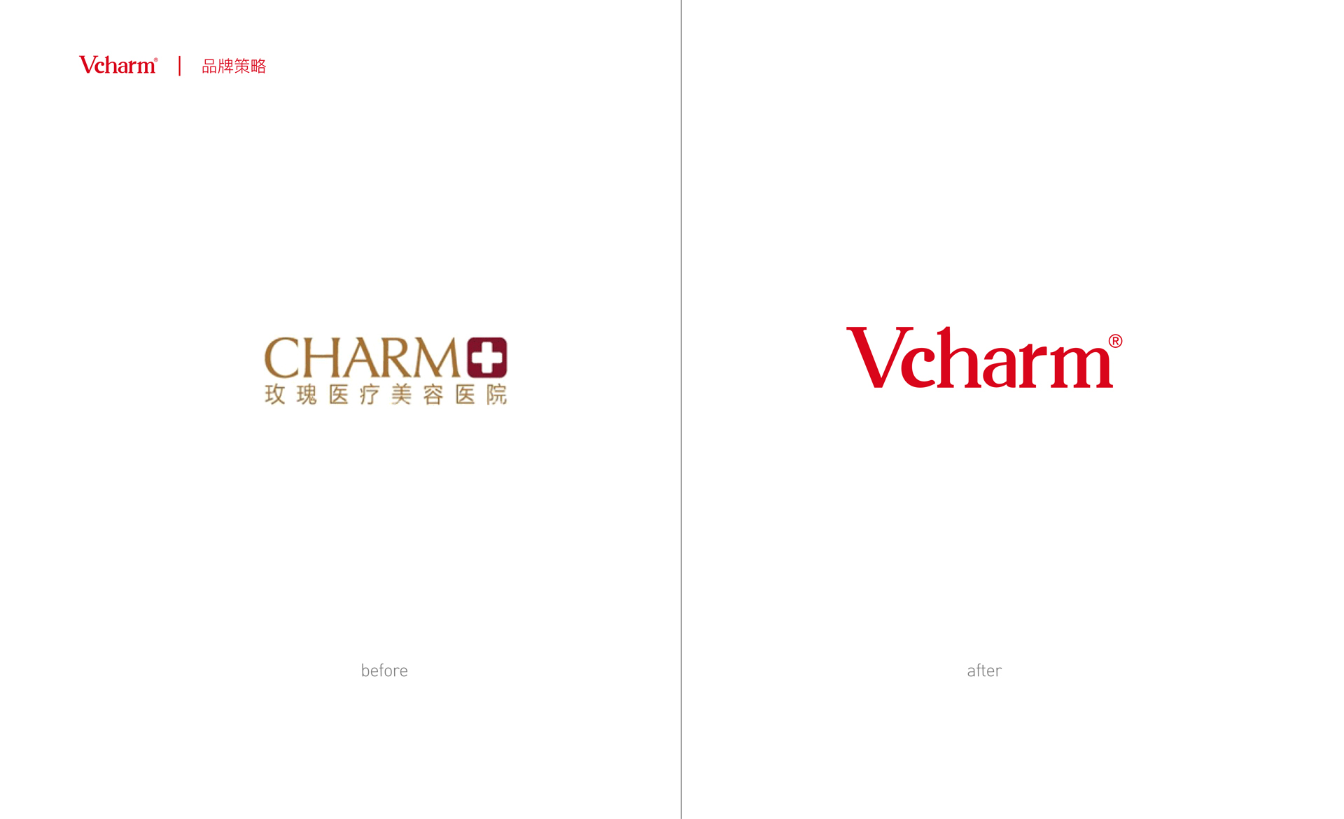 依據對美容整型產品行業的經驗和分析,和與德為Vcharm品牌定制品牌專屬色:玫瑰紅,使得品牌在行業內有一個很好的占位。其logo的設計典雅高貴,使品牌更加有包容性,為未來品牌整合做鋪墊。