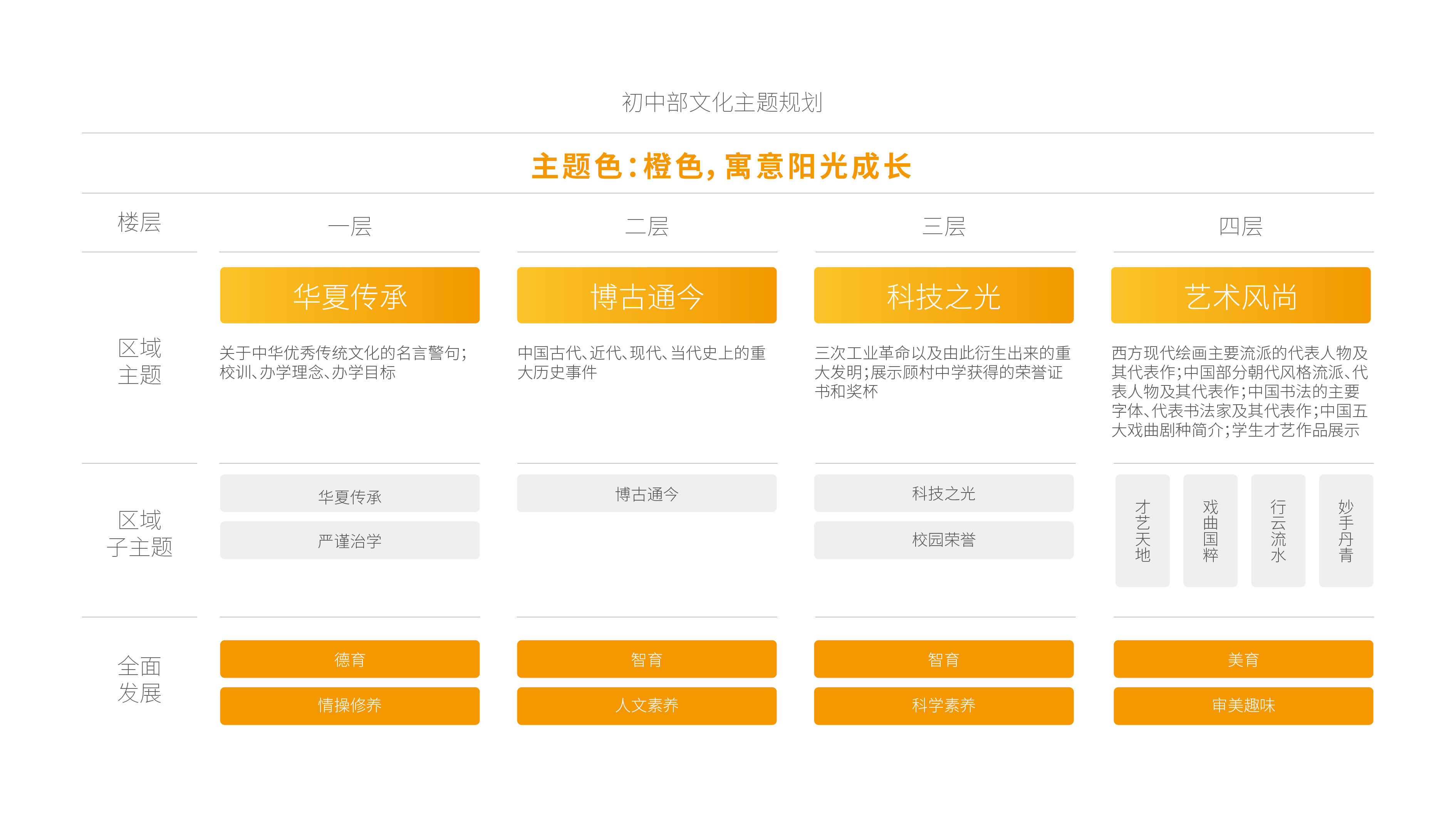和與德應(yīng)邀作為顧村中學的設(shè)計服務(wù)商對初中部的文化主題和導視進行了規(guī)劃、設(shè)計與落地,以德育、智育、美育三大功能為核心對不同樓層、不同區(qū)域的主題進行合理規(guī)劃,提升學生的全面發(fā)展能力,以此確定文化內(nèi)容和設(shè)計風格,并協(xié)助落地。
